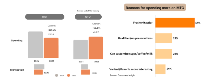 The behavior of MTO’s consumers reflects a broader desire for variety and novelty between MTO and RTD. While MTO offers freshness and customization, RTD provides convenience and quick access. Alternating between the two helps consumers balance excitement vs. practicality.